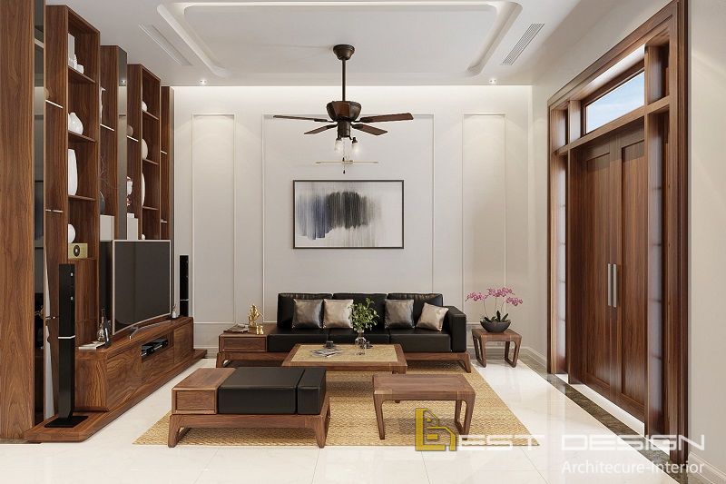 Không gian chính của căn biệt thự là phòng khách sở hữu nội thất sang trọng với 2 gam màu tương phản là trắng và nâu gỗ tự nhiên.