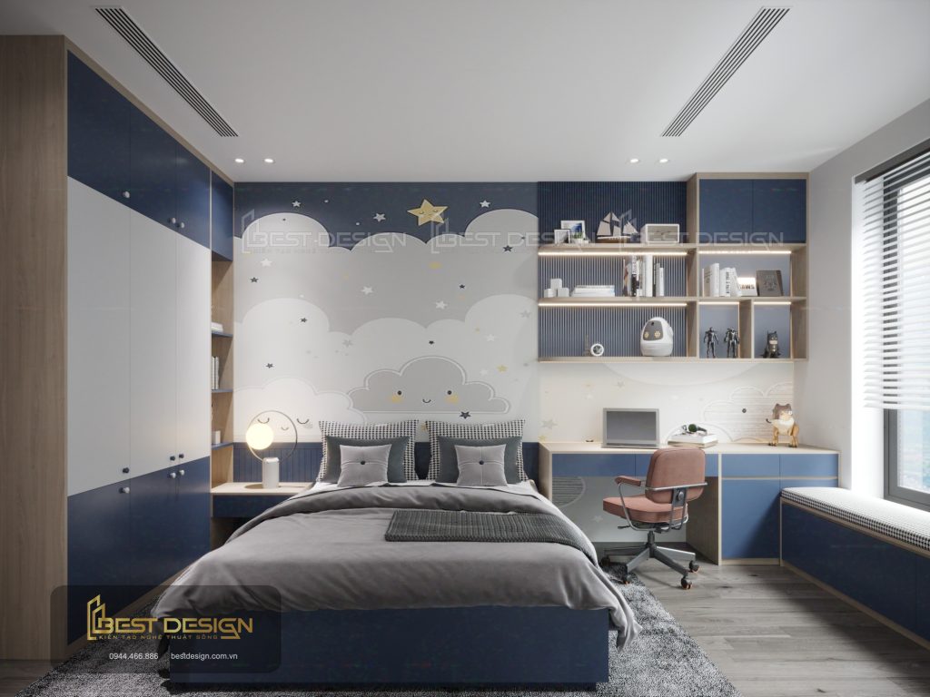 Khác với phòng ngủ master, căn phòng ngủ còn lại có lối thiết kế vô cùng màu sắc thể hiện sở thích của con trẻ. Phòng gồm: Giường, bàn học, tủ quần áo và 1 kệ tủ đa năm ôm sát cửa sổ.