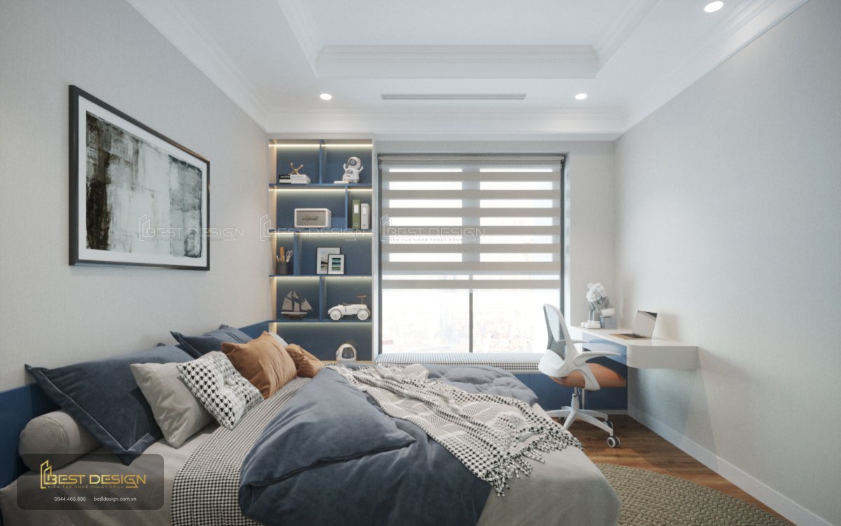 Phòng ngủ thứ 2 ngập tràn màu sắc mang đậm cá tính của con trẻ như hiểu rõ tâm ý. Kệ trang trí, bàn học cũng được bố trí hài hòa trong căn phòng tạo nên sự hài hòa tự nhiên.