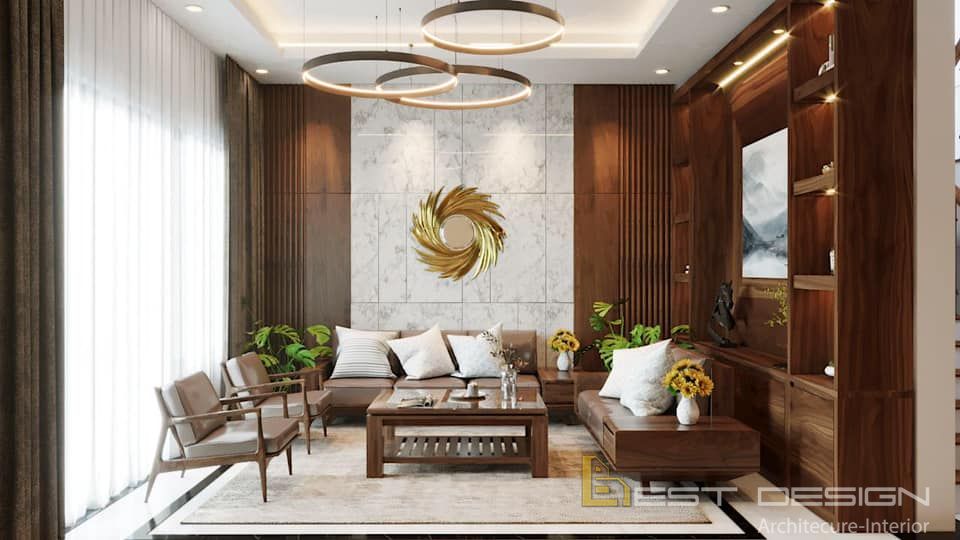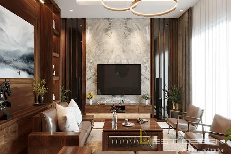 Tổng quan phòng khách được thiết kế với tông màu chủ đạo là màu của gỗ tự nhiên